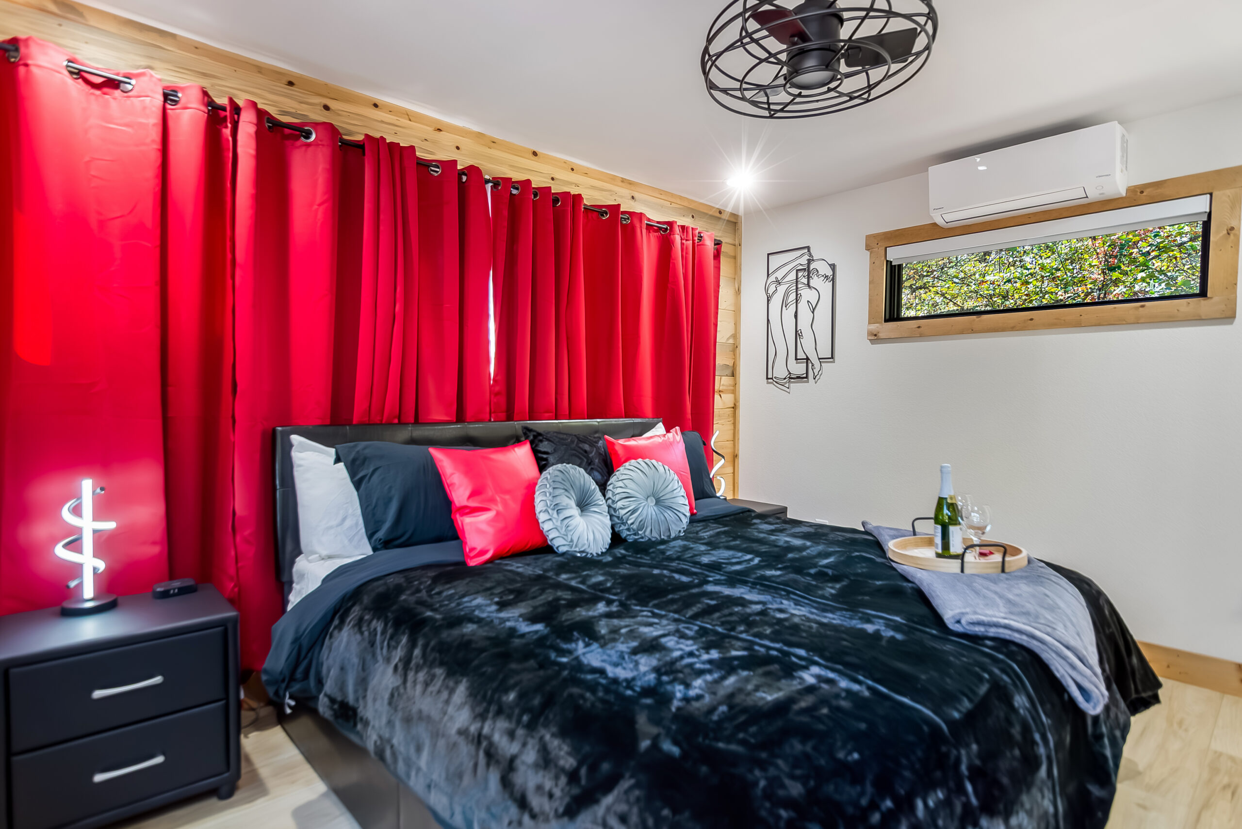 Welcome to Desire & Devotion, a design-forward, adults-only cabin crafted for connection. Tucked among the pines near Blue Ridge and McCaysville, this modern hideaway pairs privacy with sensual details, a Red Room experience, a king suite, and a steamy hot tub under the stars. This getaway is exactly what you need for a sexy celebration of an anniversary, birthday, or your relationship.